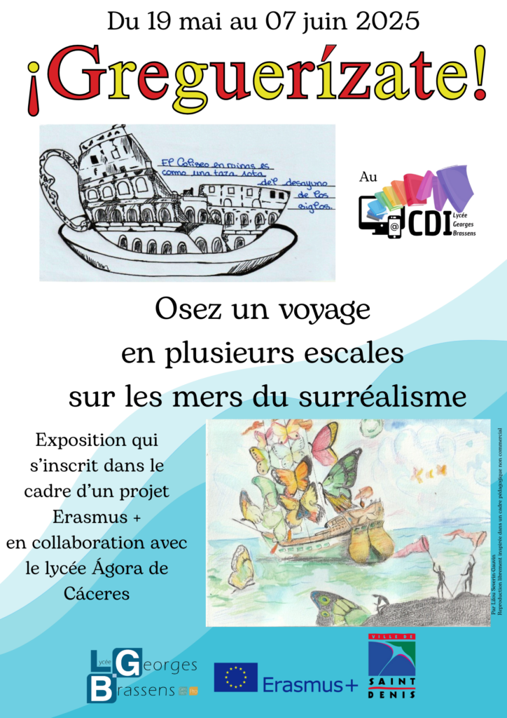 Dans le prolongement de cet événement, nous avons organisé une exposition des productions réalisées dans le cadre de ce projet associant l’IES Ágora de Cáceres au CDI du lycée Georges Brassens. La communauté éducative a donc été invitée à prendre part à un voyage fantaisiste et multilingue, en plusieurs escales, sur les mers du surréalisme. Plusieurs classes ont pu s’embarquer dans cette exploration des littératures avant-gardistes des années 20, dont la destination finale n’était autre que la propre créativité des spectateurs, appelés, à l’issue de leur visite, à réaliser à leur tour, leur propre greguería.