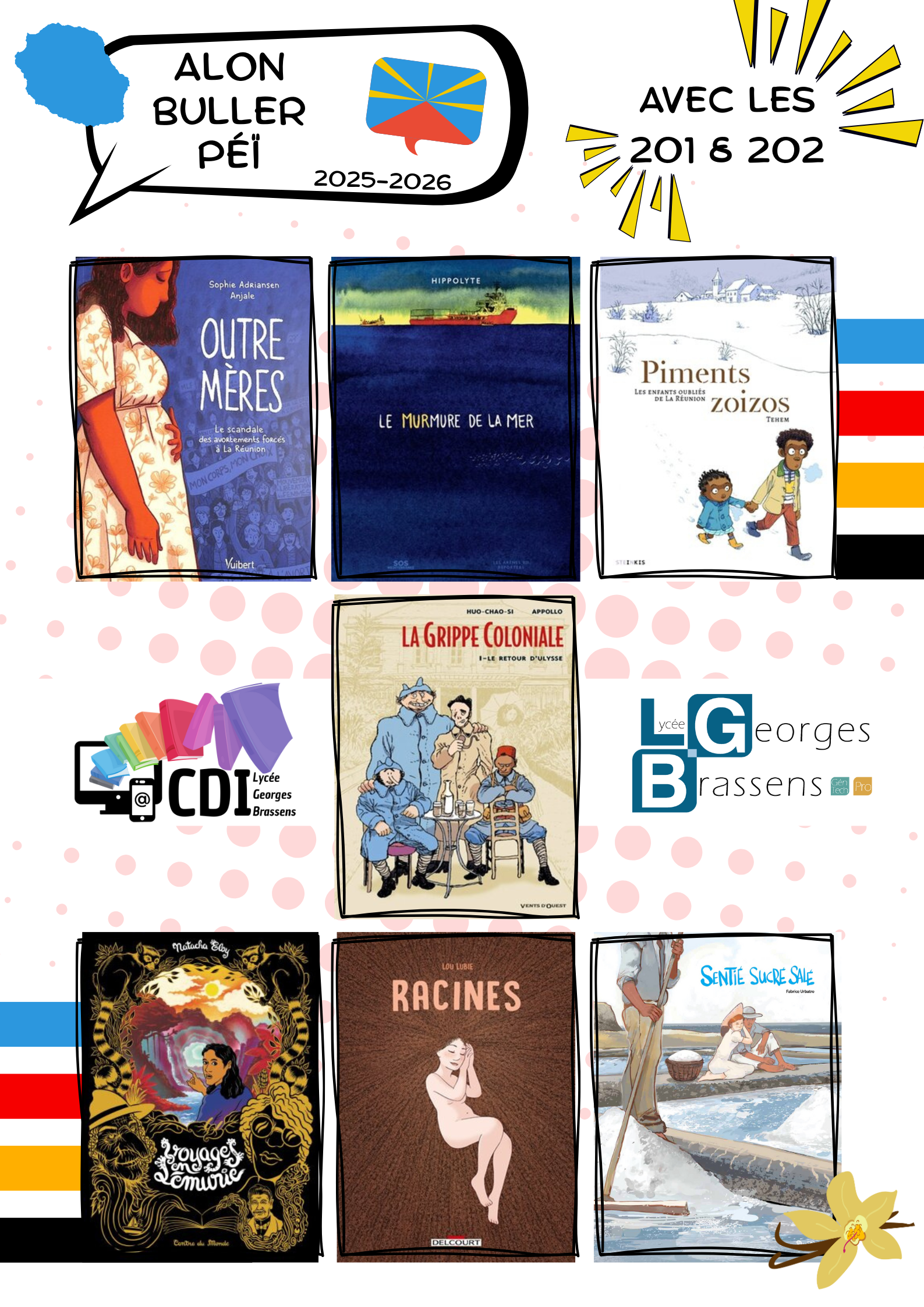 « Alon buller peï » le projet BD, à destination des élèves de seconde (201 et 202) est un projet mené par l’équipe pédagogique composée de Mme DUBARD (professeure documentaliste), M. Geslin (enseignant en Histoire-Géographie), Mme Hiot (enseignante en Lettres), et Mme Law-Pang (Assistante documentaliste)