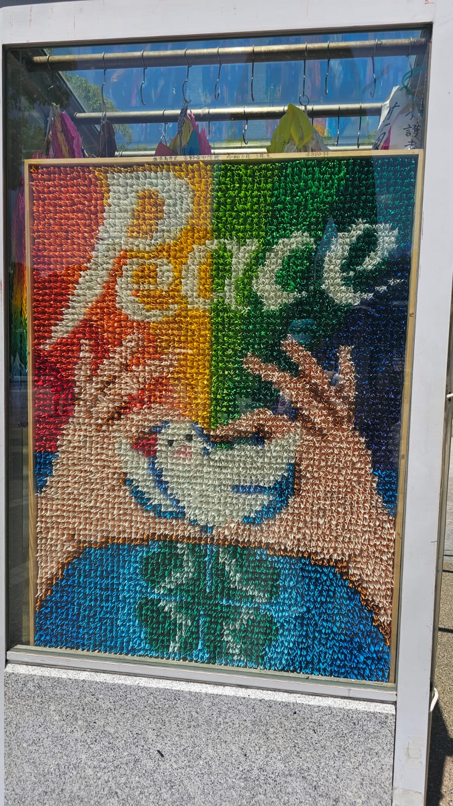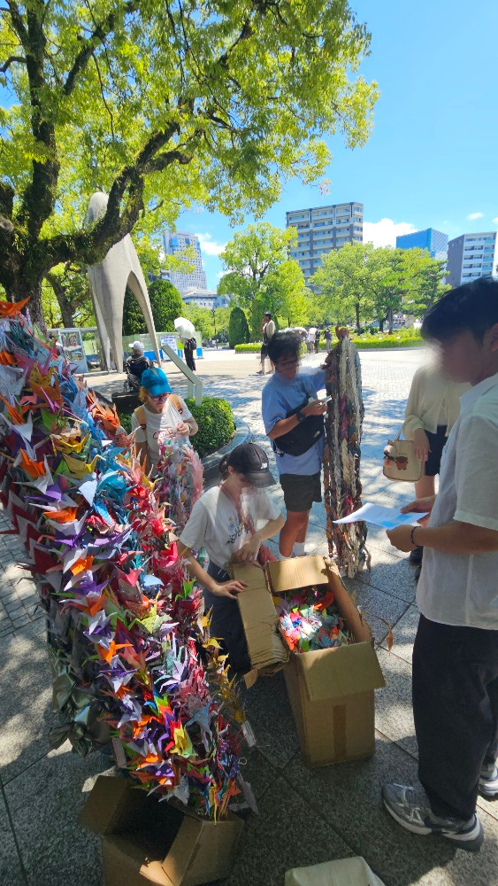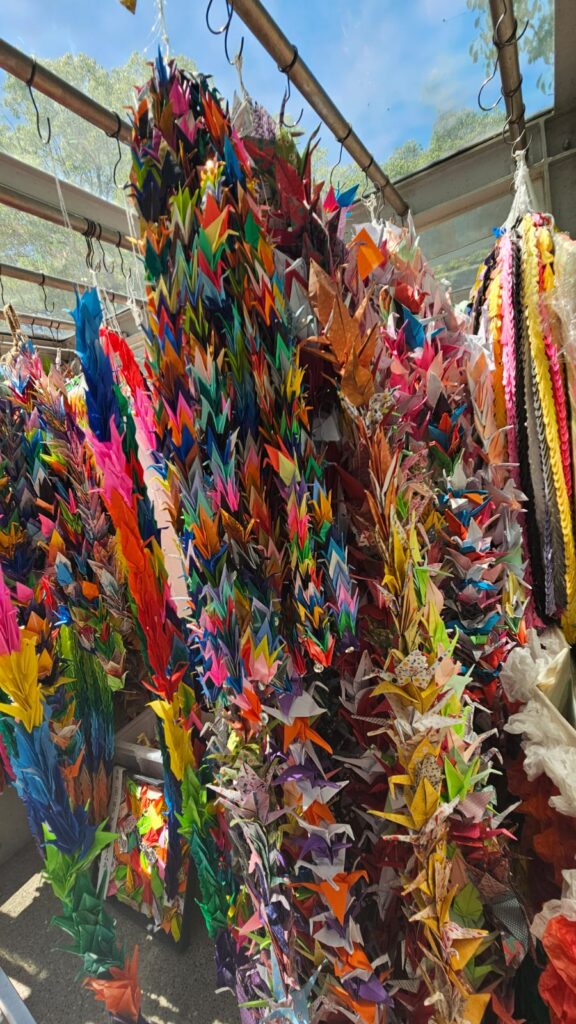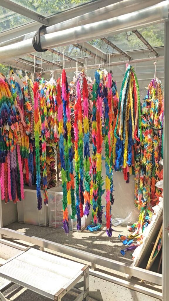 Les box situées autour du Monument de la paix des enfants recueillent les guirlandes de grues envoyées du monde entier en hommage aux victimes et en message de paix.